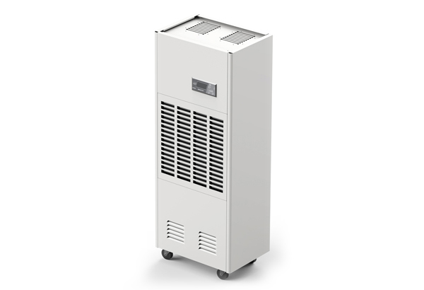 工业用除湿机通过风机将潮湿空气抽入机器内部,通过压缩机制冷将蒸发器降温至露点以下,潮湿空气经过蒸发器在表面凝结成水,汇集至接水盘后,流入水箱中,干爽空气经冷凝器重新加热由出风口排出,这样不断循环将室内湿度降低